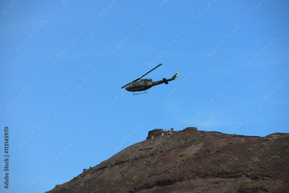 Fototapeta na wymiar - Military helicopter fly over a hill.