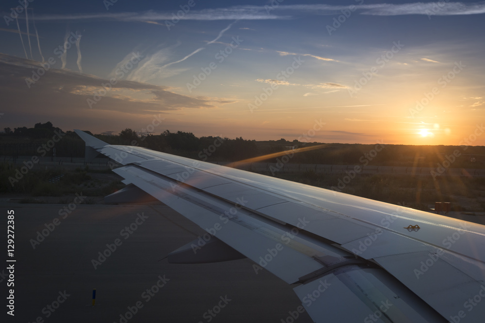 Fototapeta na wymiar - Aircraft takes off from the airport runway during sunset. View on the wing through the window.