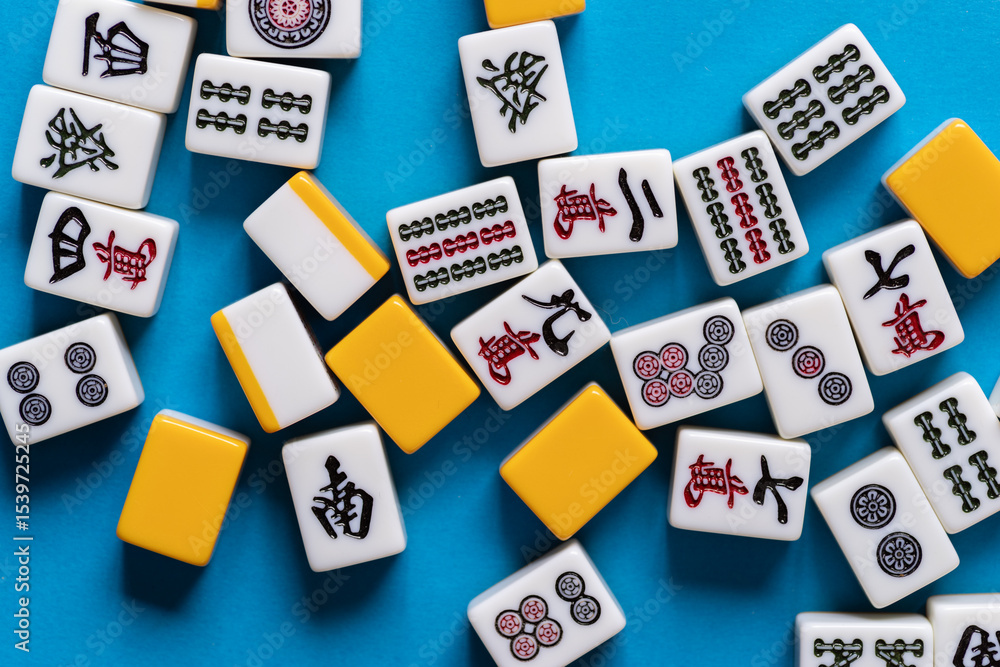 Fototapeta na wymiar - 青背景に並ぶマージャン牌 .
