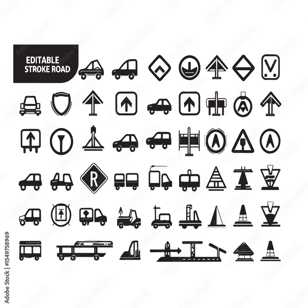 Fototapeta na wymiar - Collection of black and white editable stroke icons for road and traffic elements.