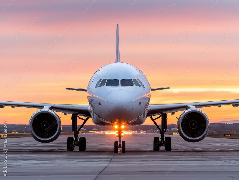 Fototapeta na wymiar - A sleek airplane faces the camera on a runway during a vibrant sunset, highlighting its details and the warm colors of the sky..