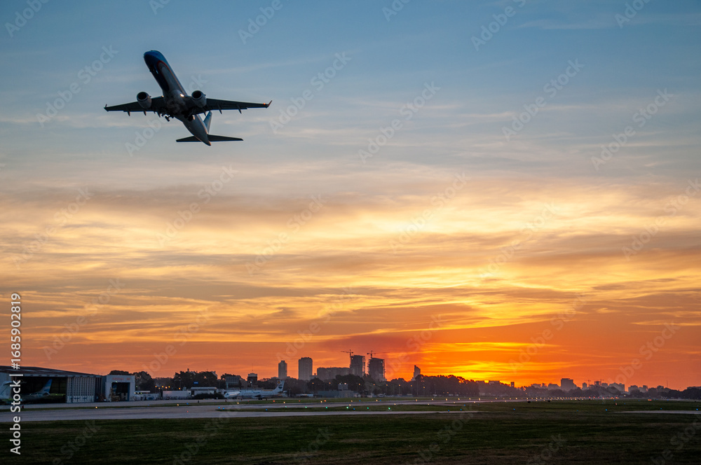 >Fototapety na wymiar>Airplane silhouette at sunset in Buenos Aires over Aeroparque Jorge Newbery airport runway. Tourism, travel, no people, transport, aviation, silhouette, flying, transportation, jet, landing, sky