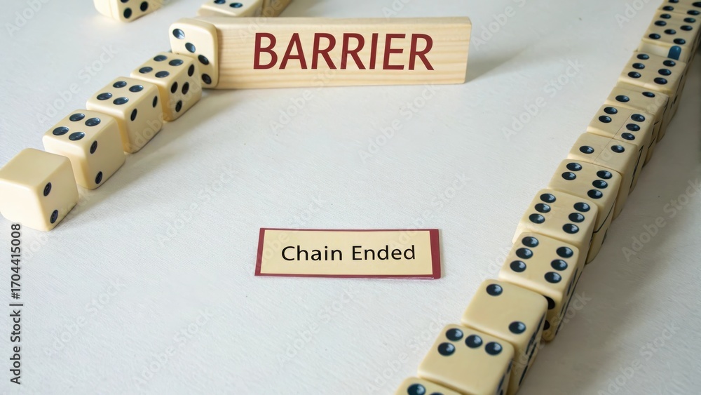 Fototapeta na wymiar - Wooden Barrier and Dominoes Indicating Chain Ended in Game Setup.