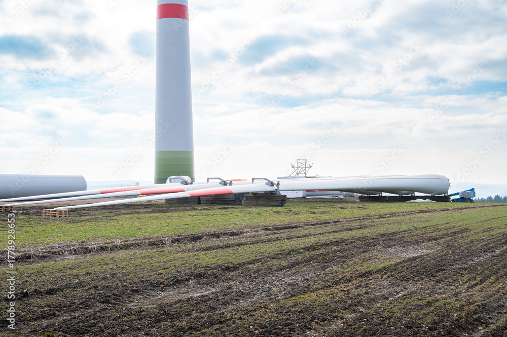 >Fototapety na wymiar>Construction site for wind turbine park, transformation to renewable sustainable energy, windfarm, environment and infrastructure in Germany