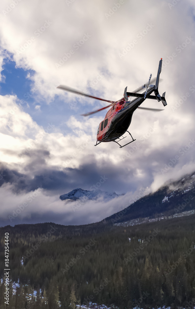 Fototapeta na wymiar - Red Helicopter In Flight Over Snowy BC Mountains With Blue Sky And Dramatic Clouds.