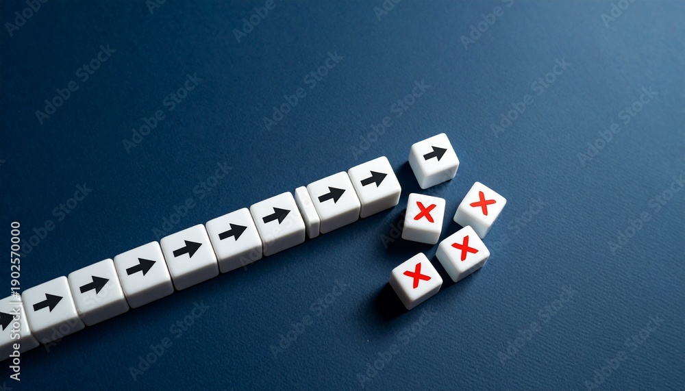 >Fototapety na wymiar>Row of White Dice with Black Arrows Breaking Through a Group of Blocks with Red and Black X Marks for Problem Solving and Overcoming Obstacles Concept