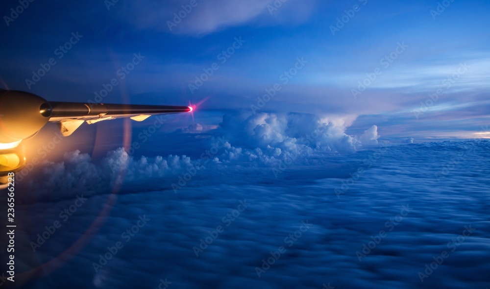 Fototapeta na wymiar - aerial view from window of an airplane. Cloud surfing early morning .