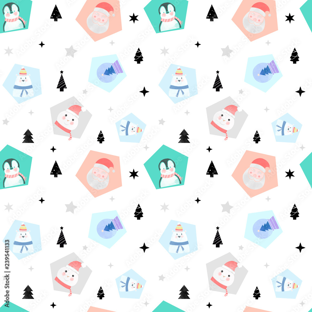 Fototapeta na wymiar - Cute Christmas elements seamless pattern. Christmas decoration with Santa Claus, bear, penguin, snowman and snow globe..