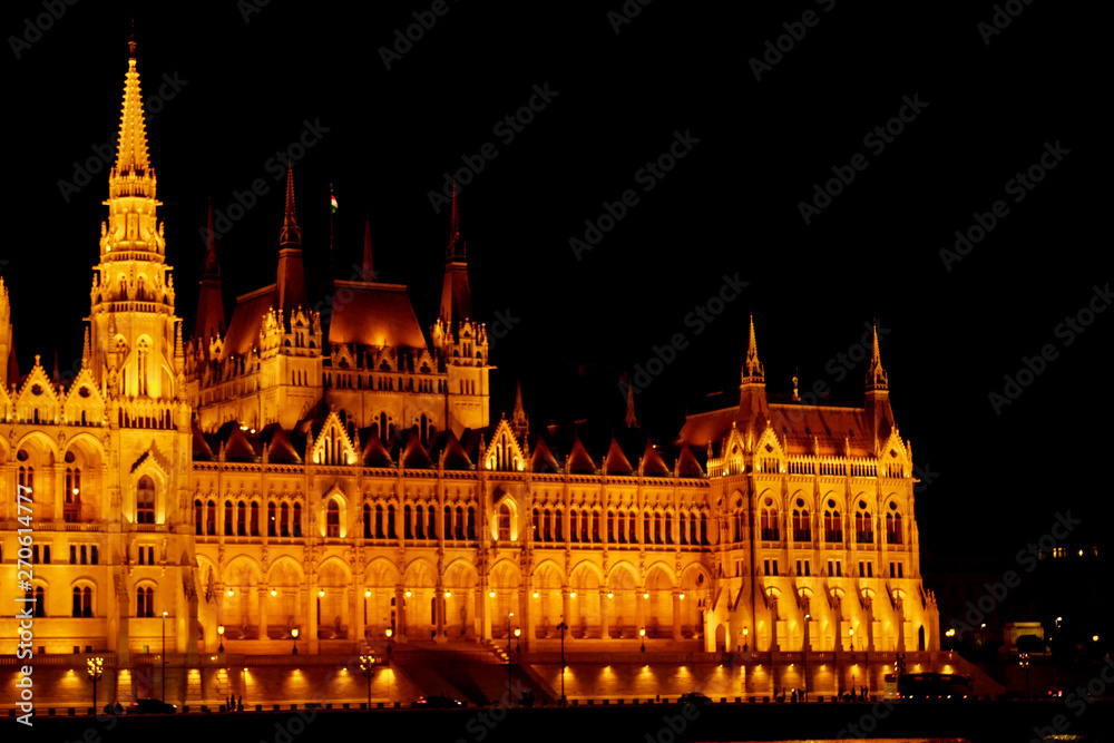 >Fototapety na wymiar>Budapest Hungary, 05.29.2019 Hungarian Parliament Building on the banks of the Danube River. night Budapest, glowing in gold. facade and roof of an old building