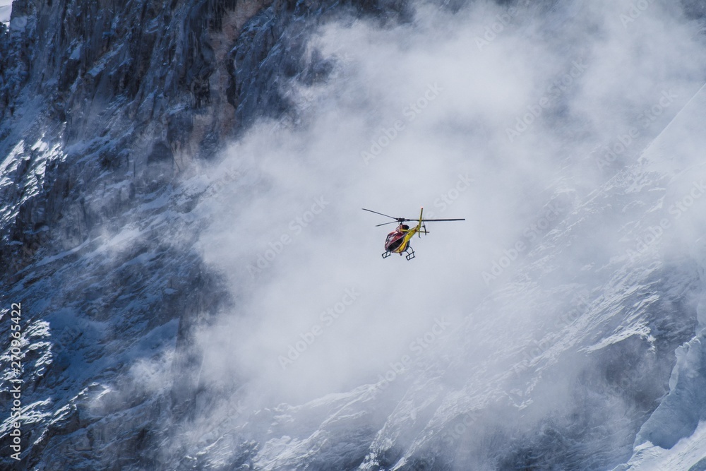Fototapeta na wymiar - helicopter in flight into cloud on snow mountain.