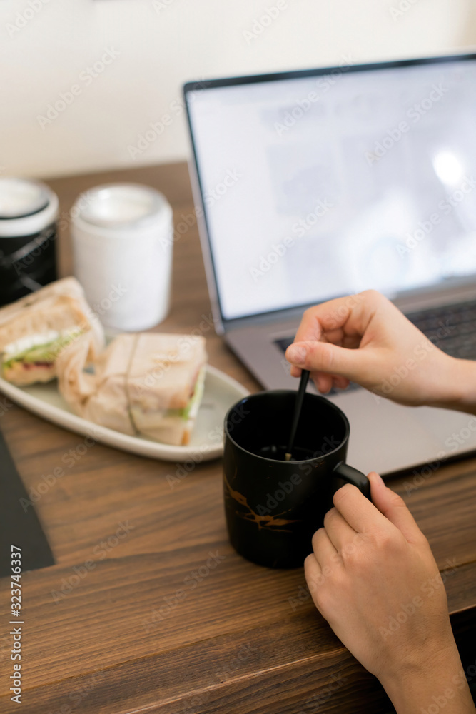 Fototapeta na wymiar - The girl sitting at a working wooden table with a laptop decided to have a snack and eat a hot tea sandwich in a black mug. Lunch break. The gadgets and technology that surround us..