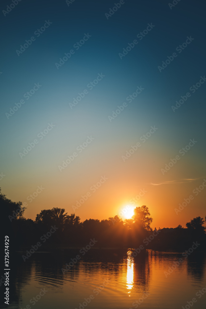 Fototapeta na wymiar - Beautiful summer autumn landscape, the sun sets in the forest, a view of the trees and grass pond, reflected in the water. Stunning bright sunset.