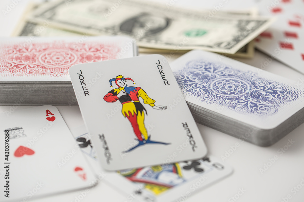 Fototapeta na wymiar - Joker card in the center of various playing cards turned both ways.