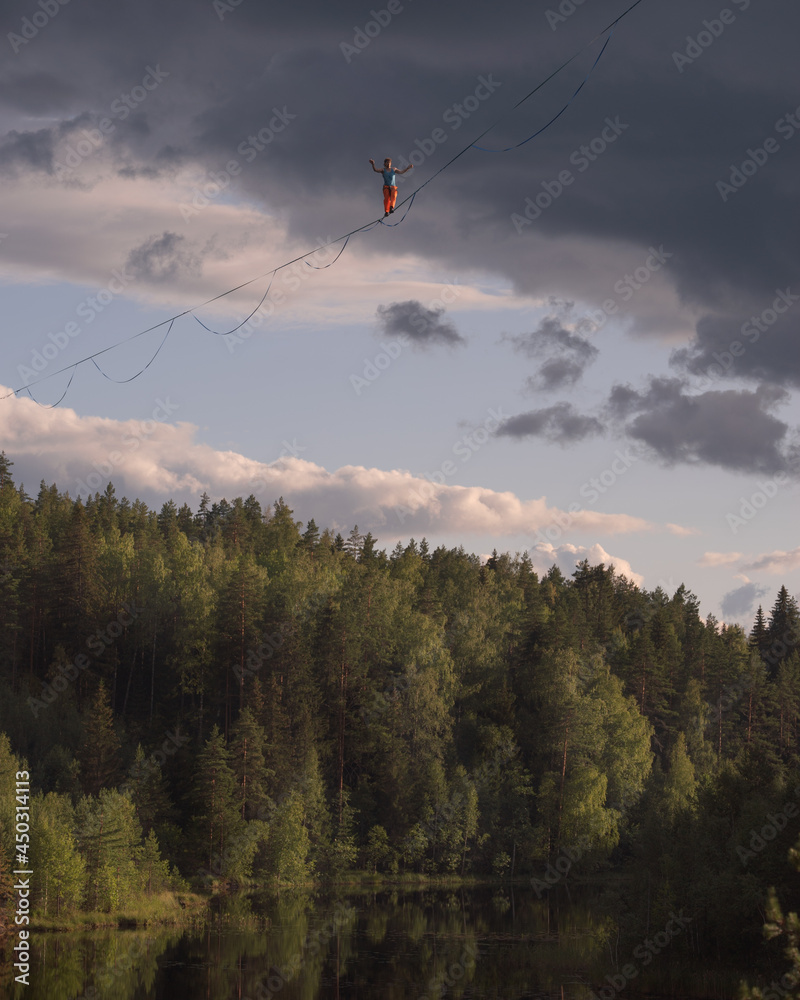 Fototapeta na wymiar - Highline over a picturesque forest lake.