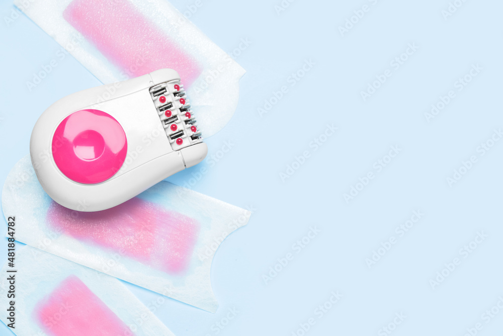 Fototapeta na wymiar - Modern epilator and wax strips on blue background.