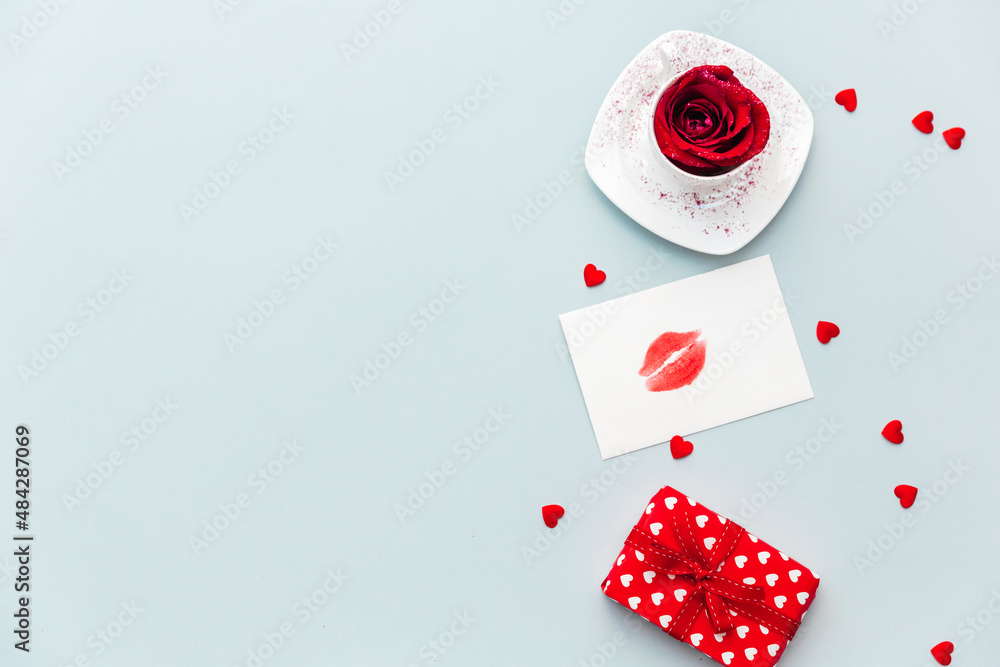 Fototapeta na wymiar - Valentine's day romantic flat lay composition with gift box, blank card and rose on a pastel background..
