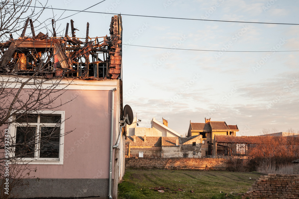 >Fototapety na wymiar>Damaged farm house of Banatsko Novo Selo in Banat, Serbia, with a burnt roof that suffered serious fire damage after an accidental disaster destroying most of the wooden structure of the building.