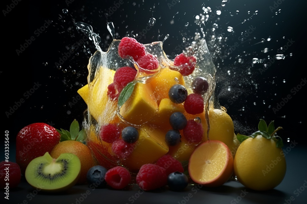 >Fototapety na wymiar>A high-speed image of fruits plugging glass dish with droplets of juice splashing out, showcasing fruits and emphasizing the freshness and vitality of the ingredients. Generative AI