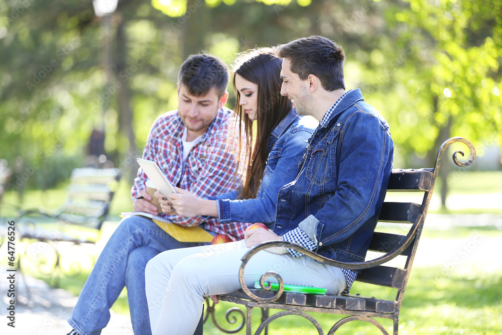 Fototapeta na wymiar - Happy students sitting in park.