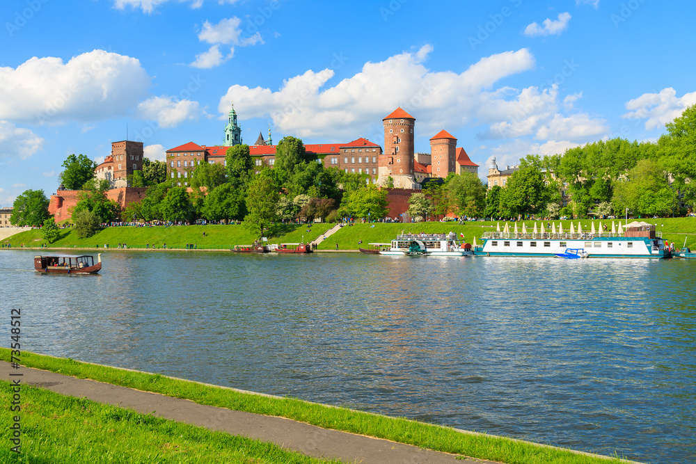Fototapeta na wymiar - Tourist boats on Vistula river and Wawel Castle, Krakow, Poland.