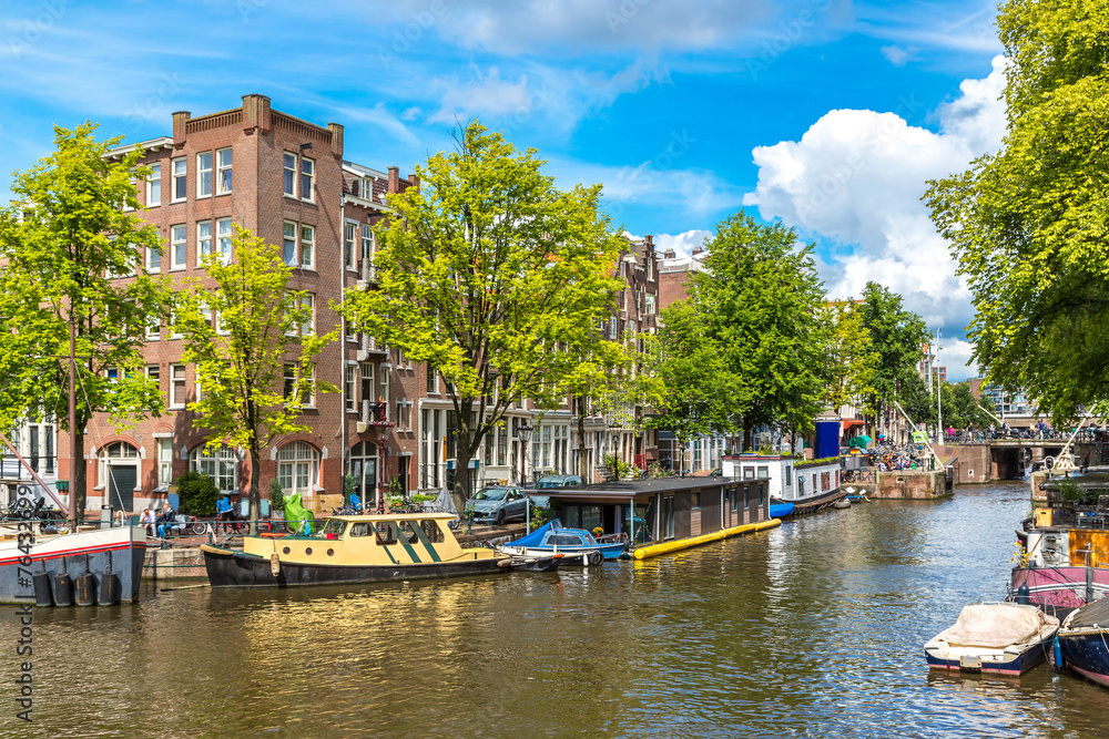 Fototapeta na wymiar - Amsterdam canals and boats, Holland, Netherlands..
