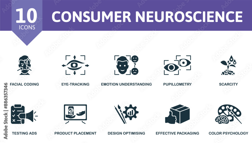 Fototapeta na wymiar - Consumer Neuroscience icon set. Facial Coding, Eye-Tracking, Emotion Understanding, Pupillometry, Scarcity, Testing Ads, Product Placement, Design Optimising, Effective Packaging, Color Psychology.