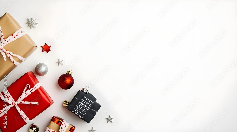 Fototapeta na wymiar - Christmas Gift Boxes & Decorations White Background.