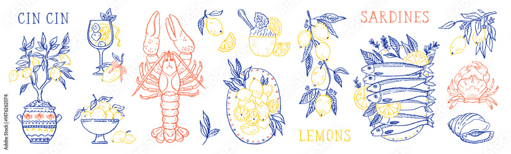 Fototapeta na wymiar - Italian doodle food. Summer sea food. Lemon Italian Amalfi beach sketch. Doodle wine cocktail, lobster, sardines. Vector summer sea beach illustration. Coastal Italy hand drawn vintage seafood icon bg.
