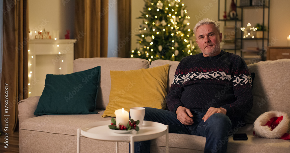 Fototapeta na wymiar - Sitting on a sofa in the living room on Christmas Eve, a lonely middle-aged man dropped his Santa's hat in disappointment. Left alone today, he set the hat aside and wears a warm sweater..