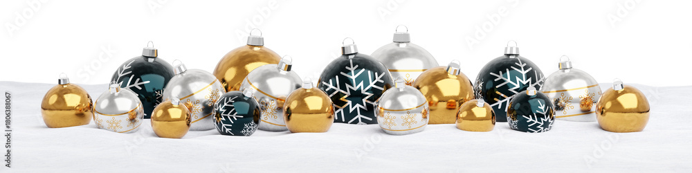 Fototapeta na wymiar - Isolated Christmas baubles alined on snow. Golden, black and silver colors. 3D rendering.
