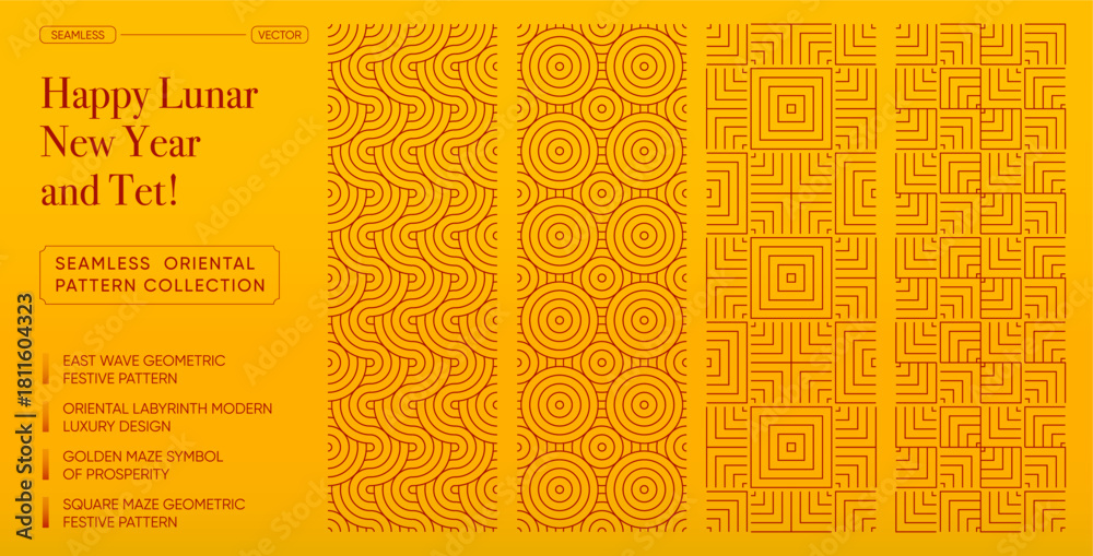Fototapeta na wymiar - Tet and Lunar New Year Seamless Oriental Pattern Collection. Golden maze, circle, and wave line textures for prosperity, Tet celebration and elegant Lunar New Year geometric design patterns.