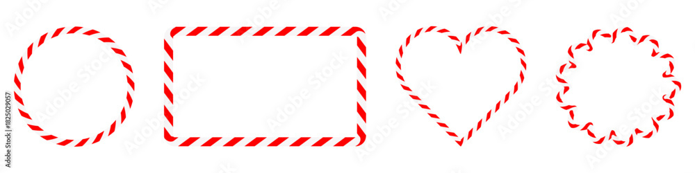 Fototapeta na wymiar - Collection red and white candy cane striped geometric outlines, including circle, rounded rectangle, heart and scalloped circle.Festive set for Christmas design, holiday decor.