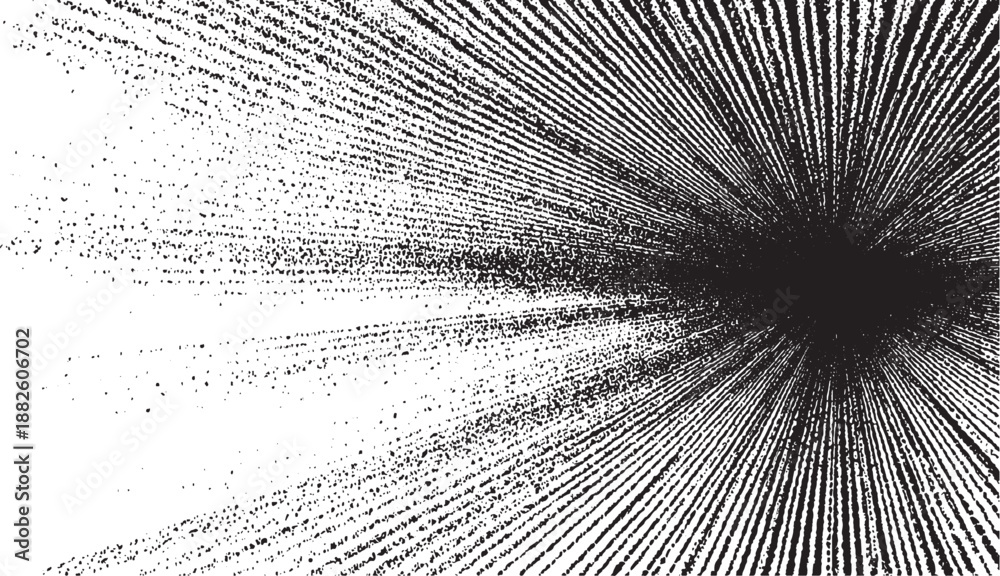 Fototapeta na wymiar - Abstract radial burst of black dots and lines emanating from a dark central point against a stark white background creating a dynamic and energetic visual effect.