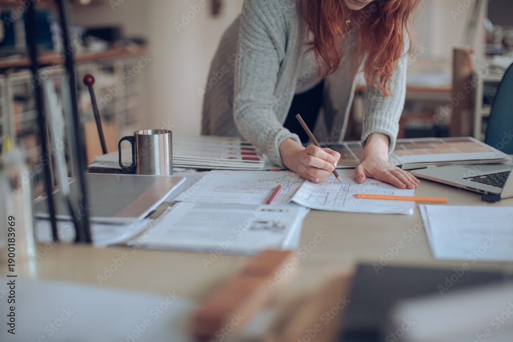 Fototapeta na wymiar - Female architect sketching blueprints at office desk.