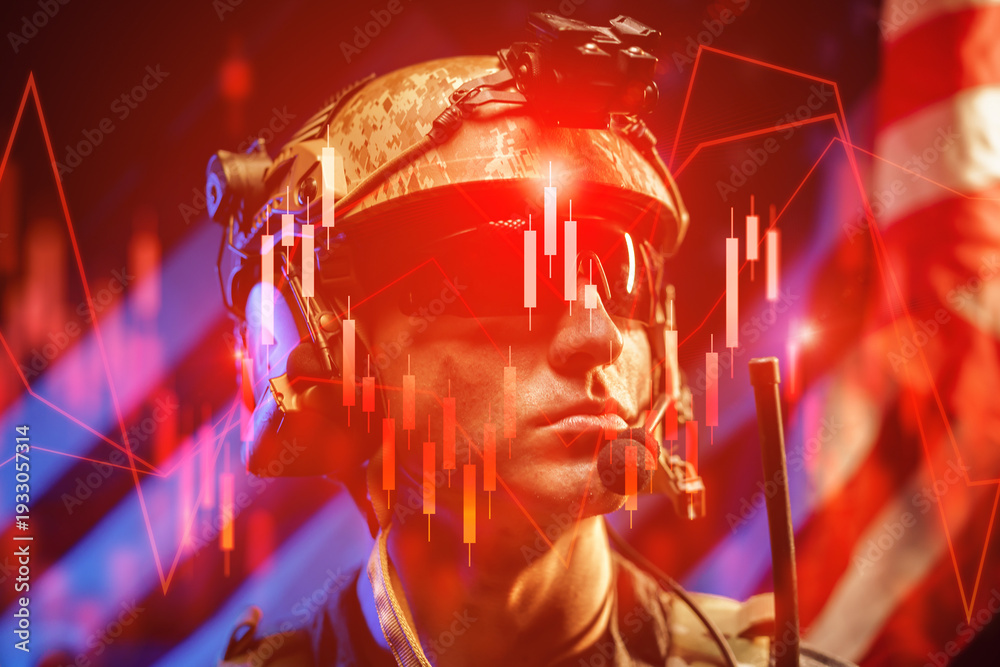 Fototapeta na wymiar - Iran USA conflict shows soldier in gear with financial data behind during oil crisis.