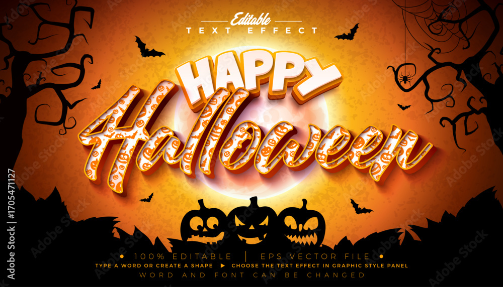 Fototapeta na wymiar - Happy Halloween Text Effect Illustration Editable Graphic Style with Pumpkin Pattern Typography Lettering on Scary Cemetery Halloween Background. Scalable Vector Autumn Holiday Design Template.