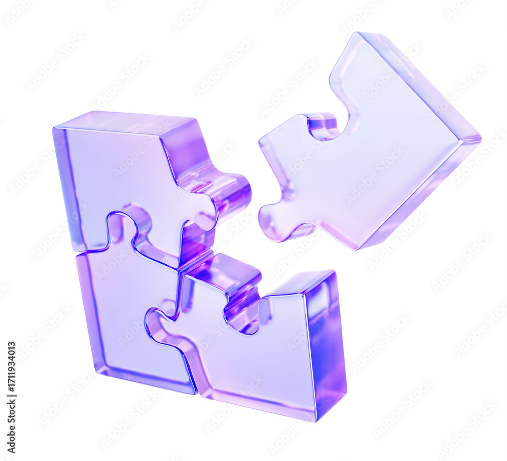 Fototapeta na wymiar - 3d holographic glass morphism puzzle pieces. Purple gradient jigsaw game elements, connected group, assembly process. Crystal hologram blocks during connection, isolated render icon.