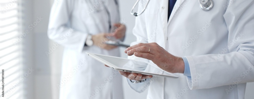 Fototapeta na wymiar - Doctors working together on medical records while a healthcare professional uses a digital tablet for patient data management in a technology-driven clinic.