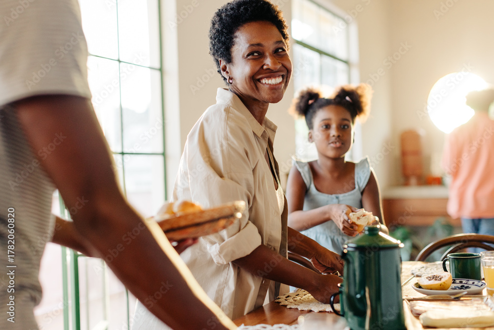 Fototapeta na wymiar - Mom and kids setting the table for a delicious Brazilian breakfast with pão de queijo.