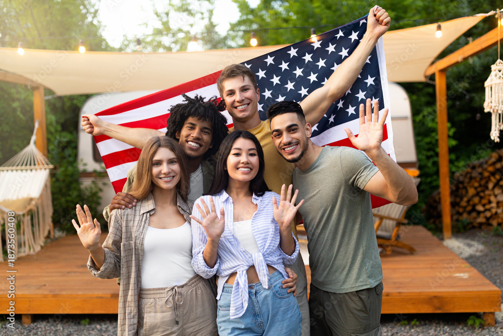 Fototapeta na wymiar - Portrait of multiethnic millennial friends with American flag waving at camera and smiling, posing near RV at camping site. Group of diverse young people celebrating patriotic holiday together outdoor.