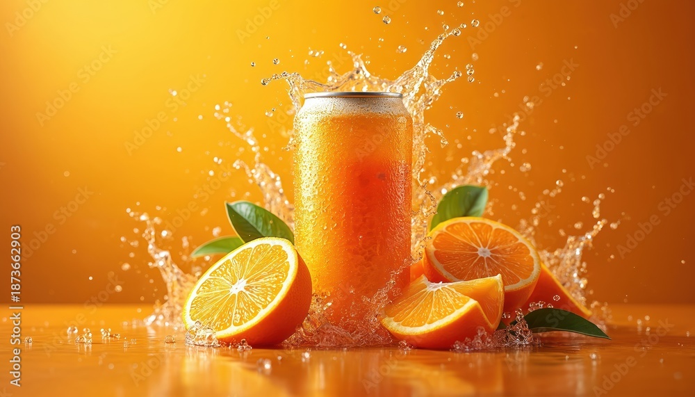 >Fototapety na wymiar>Wybrane motywy - zobacz więcej !>Słoń>Illustration of orange soda can with citrus explosion. Fresh orange juice splash and slices on table. Refreshing drink concept. Ideal for food beverage design materials.