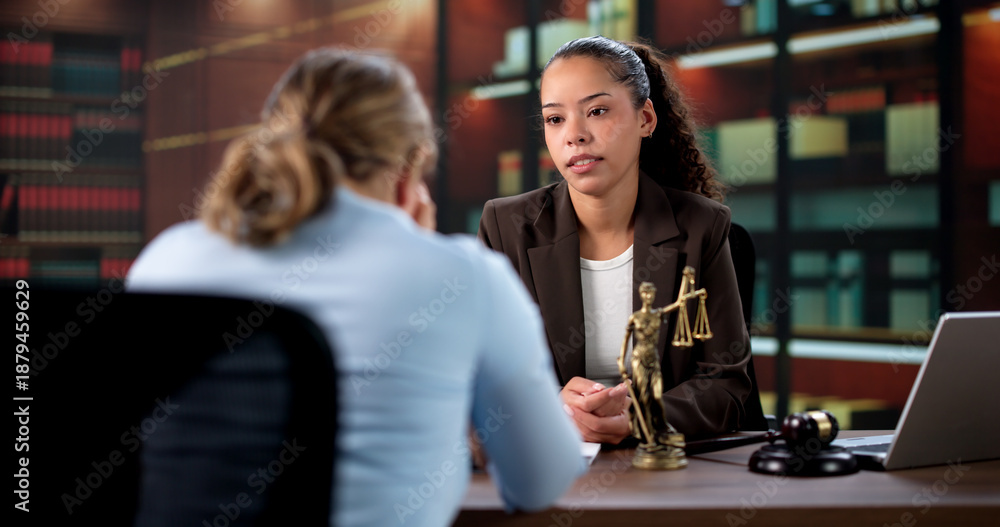 Fototapeta na wymiar - The Sad Attorney Consoles Her Upset Hispanic Client After.