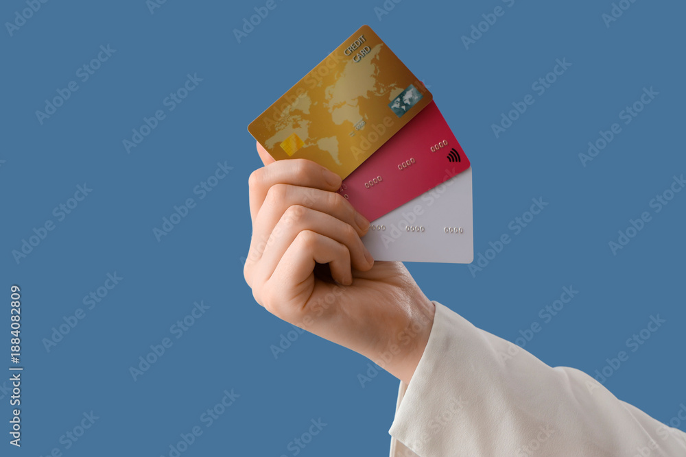 Fototapeta na wymiar - Female hand with credit cards on blue background, closeup.
