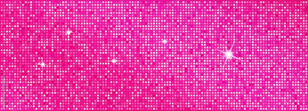 Fototapeta na wymiar - Pink disco ball sparkles with glitter texture, creating a glamorous party backdrop. Shimmering sequins and mosaic patterns shine under neon lights for retro celebrations..