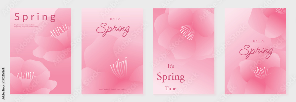 Fototapeta na wymiar - Spring flower gradient poster vector set with pink floral blossom and soft pastel background. Elegant seasonal design for greeting card, invitation, social media, wall art and branding..