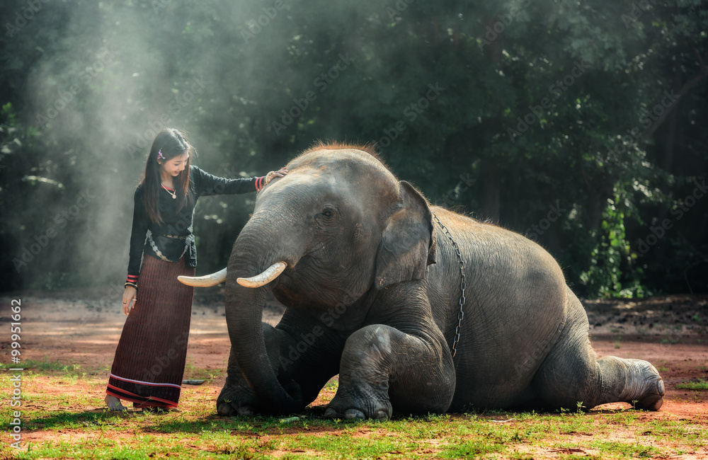 Fototapeta na wymiar - Thai Traditional fashionable lady with elephant.