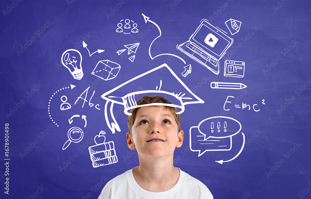 Fototapeta na wymiar - Kid imagining education with doodles on chalkboard background in.
