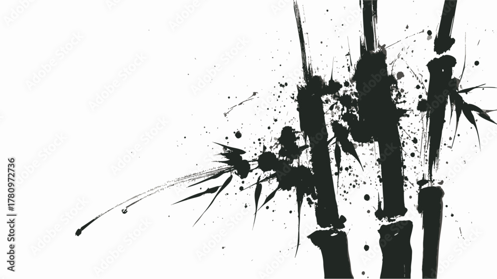Fototapeta na wymiar - Japanese sumi-e bamboo ink illustration with expressive brushwork and artistic splatter effect on white background.