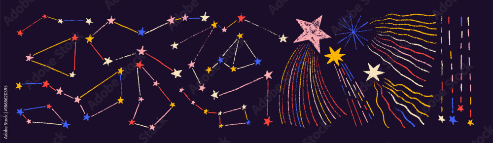 Fototapeta na wymiar - Crayon drawn funky constellation and shooting stars stickers on dark night background. Pencil drawing cosmic elements. Abstract astrology doodle clip art icons. Kid's doodle stars with pencil texture..