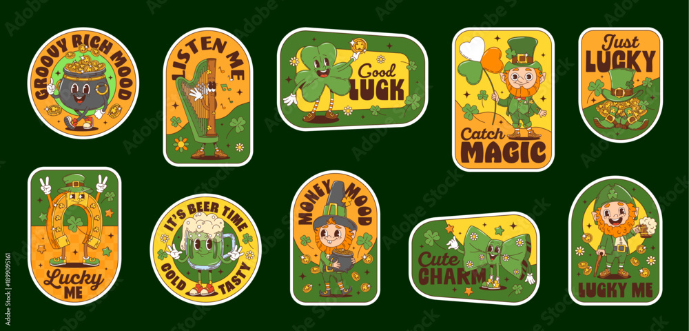 >Fototapety na wymiar>Wybrane motywy - zobacz więcej !>Taniec>St Patrick Day holiday groovy label stickers and hippie patches with cartoon leprechaun characters. Retro psychedelic St Patrick Day vector stickers of groovy lucky clovers, gold pot and horseshoe